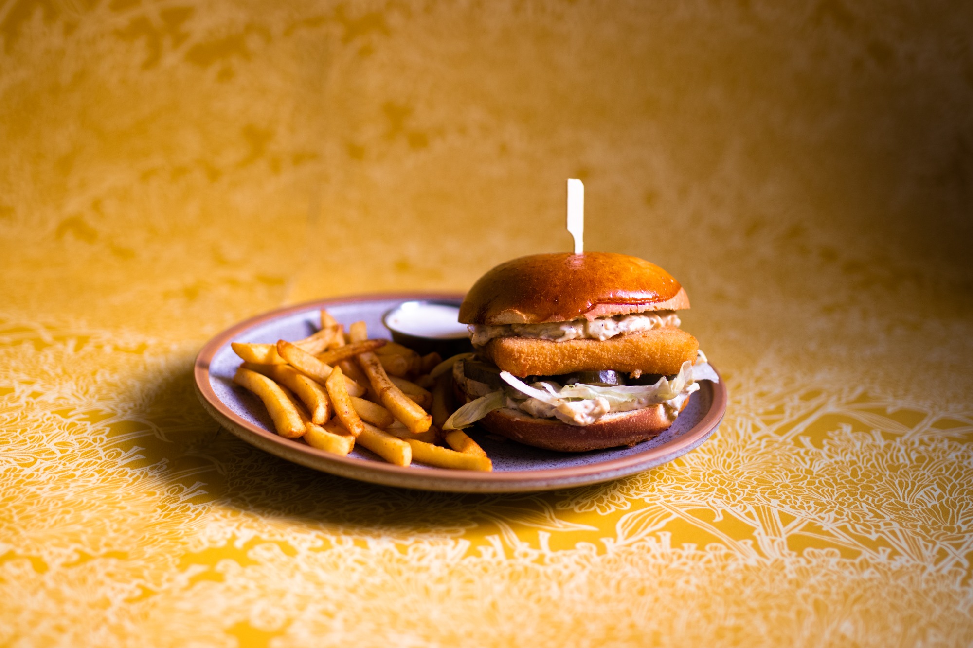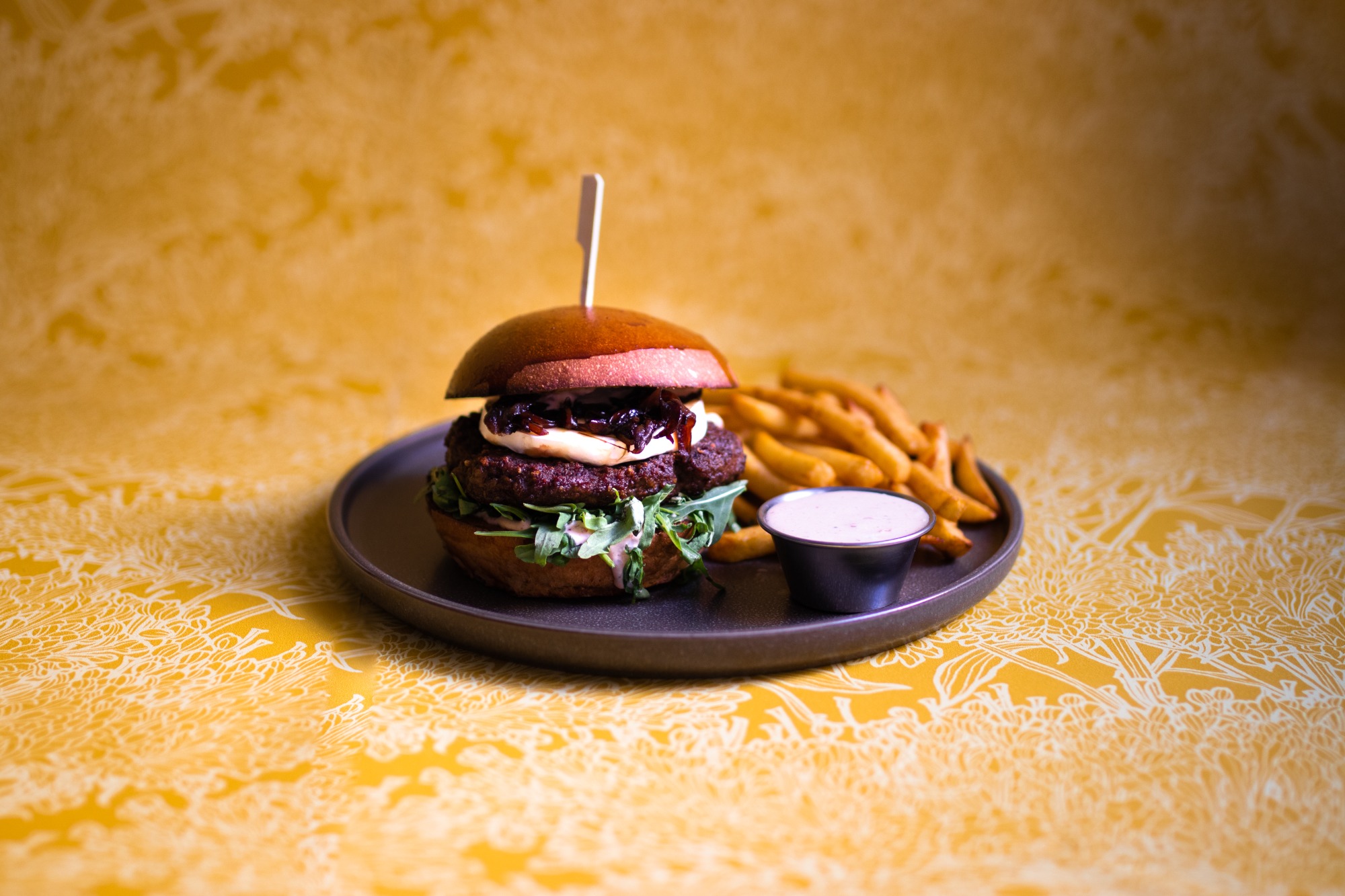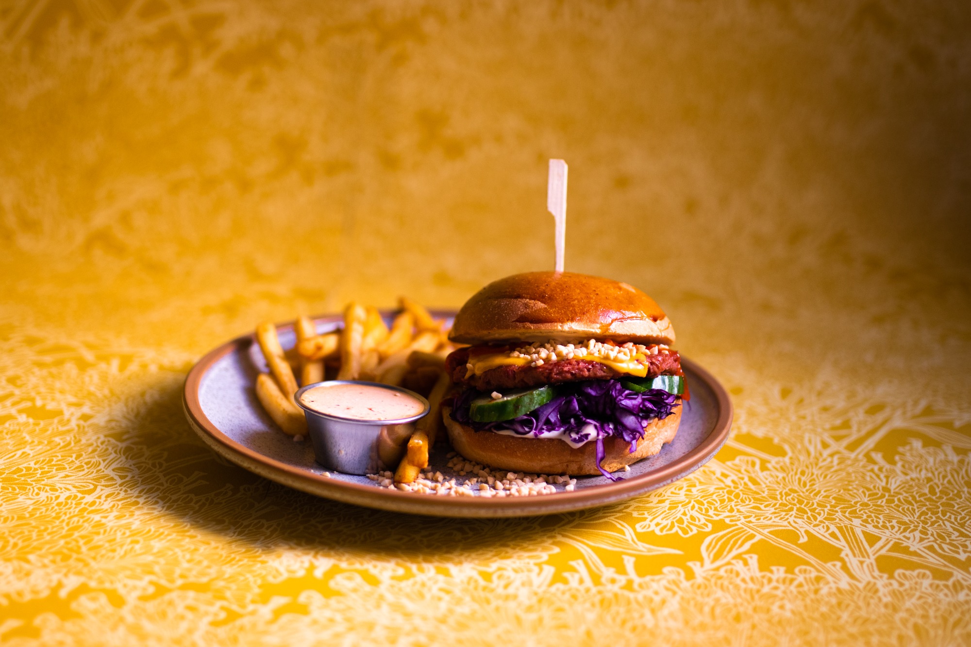 roślinny nuggetsy "The Vegetarian Butcher" 100g, sos miso-majo, ser cheddar, pomidor, sałata lodowa, sos miso-majo, czerwona cebula, sos BBQ